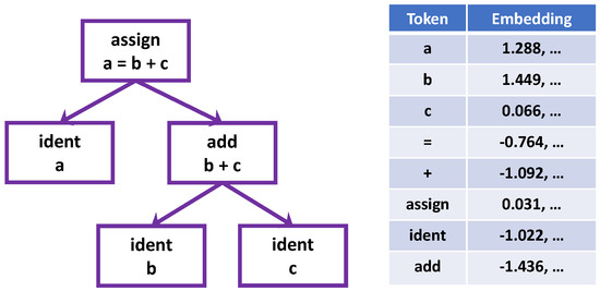 Because of the wide variety of possibilities of naming identifiers, DL models of representation learning [32] also face the problem of vocabulary explosion. In order to address this issue, refs. [15,33] define a set of keywords, such as VAR1, VAR2, FUNC1, FUNC2, and use them to replace the variable and user-defined function names. This method can indeed reduce the number of unique tokens, but at the same time, it could mislead models since the same keywords could have different semantics in different settings.