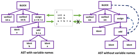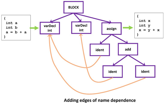 In this work, we suggest a new kind of edge of name dependence, and a type of ASG, which adds the edges of name dependence to AST and removes the names of variables from it without changing the semantics of the code. Abstract syntax graphs are not a new concept and many studies have suggested different ASG graphs from AST for different purposes [38,39,40,41,42], and named them differently, either abstract syntax graph, abstract semantic graph or term graph. They are mainly applied in software engineering for graph transformation [38], program optimization [39,40] and code refactoring [41].