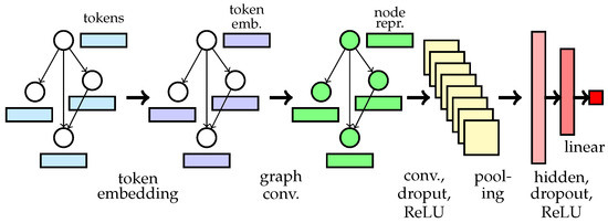 In order to better evaluate and compare our techniques to the code-based encoding scheme, we follow the design of existing graph-based models for software vulnerabilities [10,14] and use the gated graph recurrent unit (GGRU) [43] as the graph convolution module to learn a graph representation. All models share the following architecture: The graph data of code is first delivered to an embedding layer to learn token embeddings. The learned embeddings and the graph structure are fed into the module of GGRU with one time step, the least expensive option, to perform the operation of graph convolution. The output of GGRU is sent to each of three 1D convolution (Conv1d) layers with 128 filters each and perceptive fields of 1, 2 and 3, respectively, and one 1D max pooling (MaxPool1d) is applied over the output of each Conv1D to downsample. The results of the MaxPool1d layers are concatenated together and sent to a linear hidden layer with 128 neurons, and a 25% dropout is applied to the output of the convolution and hidden layers as a regularization mechanism. We apply ReLU [44] for non-linear transformation because of its computational efficiency and the reduced likelihood of gradient vanishing and use embeddings with 100 dimensions to encode tokens. The architecture is illustrated in Figure 4.