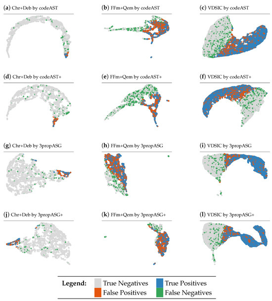 The quality of data ultimately determines what quality a DL model can achieve. To analyze the quality of data and models, in this section, we will examine the representations learned by the models and how well these representations separate positive (vulnerable) from negative (non-vulnerable) samples. One way to do this is to visualize these representations and their separability. Two popular techniques for visualizing high-dimensional data are t-SNE [48] and UMAP [49]. In this work, we are using the latter, because it can preserve a more global structure and is computationally more efficient than t-SNE.