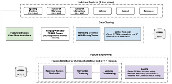 The following section first describes the full pipeline, consisting of feature extraction, data cleaning, and feature engineering. This is presented in Figure 2. To curate the dataset that served as input to this pipeline, we extracted the nine time-series features from the MP4 files of the 17 teams that were included in the final dataset. The students who did not sign an informed consent form were excluded from the feature extraction and analysis using our visual speaker identification pipeline. Subsequently, all teamwork sessions in a day were concatenated and assigned to the corresponding daily PERMA scores, as scores were collected at the individual level and on a daily basis. In this way, this study assumed that only the teamwork sessions (and not the other workshop sessions) were reflected in the well-being scores. In addition, each day was considered independently of the others for each speaker, resulting in up to three data points per speaker, as the teamwork sessions occurred on three out of four workshop days. This left a total of 87 data points.