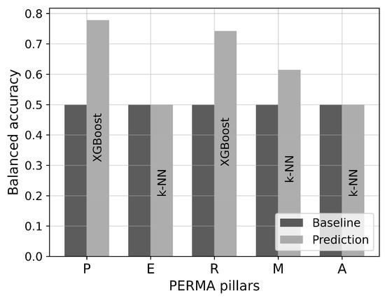 Baseline based on chance level vs. prediction balanced accuracy by PERMA pillar on the test subset for the two-class version. For each pillar, the best model from the validation set is shown.