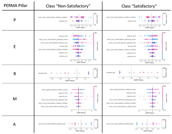 The main focus of this study was on analyzing the speech data collected during the workshop week. The preparation and extraction of the following speech features will be described subsequently.According to Wilson [54], happiness is related to being extrovert and vocative, and extroverts generally talk more than introverts [55]. Thus, speaking duration can serve as an indicator of well-being and was therefore included as a feature in this study. This included the speaking time in seconds, as well as the number of utterances. As extroverts tend to be more likely to interrupt others in conversations, whereas introverts tend to avoid such behavior [56], we used the number of interruptions as an additional audio feature. Last but not least, since positive emotion is considered the first pillar of the PERMA model, this study focused on the calculation of emotional features as the first component of the analysis.