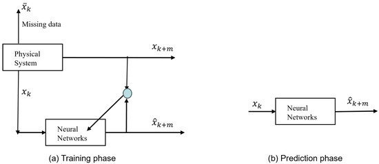 Time series forecasting using neural networks. Here, is m-step ahead prediction. is the neural network approximation of . is the time series. is the missing data.