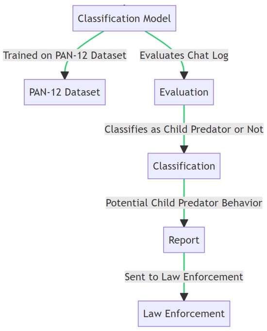 - Step 5: Chat Logs Sent to the Classification Model. Upon concluding the conversation, chat logs are analyzed by an ML classification model. This model scrutinizes the dialogue for specific linguistic and behavioral indicators of predatory intent, such as grooming techniques or attempts to elicit personal information. The model’s training emphasizes the identification of nuanced predatory patterns, balancing sensitivity to predatory cues with the necessity to minimize false positives, thereby ensuring ethical considerations regarding privacy and accuracy are upheld.