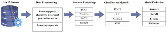 A novel methodology that integrates fastText embeddings with ML classifiers, notably focusing on the SVM classifier, to differentiate between predatory and non-predatory chat logs, was introduced. This approach capitalizes on the established efficacy of fastText across diverse text classification scenarios, utilizing its robust word embeddings that adeptly encapsulate morphological information [,]. This aspect is particularly crucial for analyzing informal texts characterized by non-standard language usage.