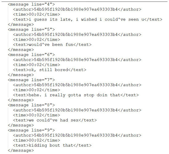Figure 5 illustrates an example of a predatory conversation from the PAN12 dataset, highlighting the structured data format that includes detailed interaction attributes such as message sequence, author identity, timestamp, and textual content. This example showcases the dataset’s capability to provide a detailed and structured framework for analysis.