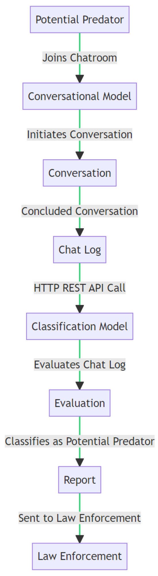 Operationally, the model is hosted on a server setup designed to seamlessly integrate with the conversational model through a PHP API, facilitating real-time analysis of chat logs. Upon receipt, each chat log undergoes a rigorous evaluation process. This is not merely a binary classification; it is an in-depth analysis aimed at identifying nuances and patterns indicative of predatory intent. When potential child predator behavior is identified, the system escalates its findings by compiling a detailed report—encompassing the chat log and pertinent details—for submission to law enforcement, thus enabling a timely and informed response.