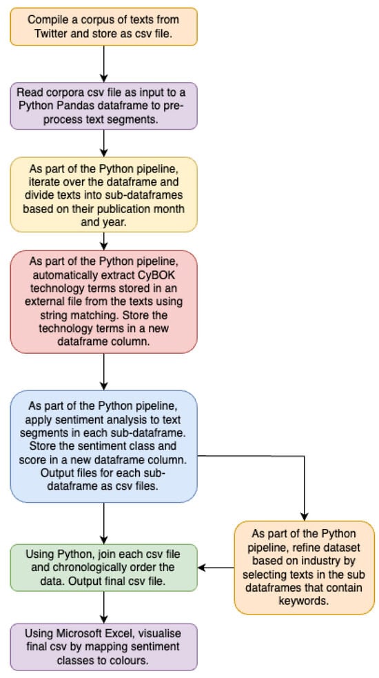 To extract such data at scale, automated techniques are needed to collect and programmatically extract relevant information from publicly available sources. Such sources may include online social media platforms (e.g., Twitter), in which users can publish their content, presenting a wealth of information surrounding their opinions and experiences [8]. To automatically extract and process large volumes of texts originating from diverse sources, text mining techniques may be used [9]. In particular, sentiment analysis, often referred to as opinion mining, aims to automatically extract and classify the sentiments and/or emotions expressed in text [10,11]. In the context of the aforementioned problem definition, we hypothesise that the expression of positive sentiment implies opportunities and positive experiences surrounding emerging technologies, which, therefore, increases the likelihood of impacting a technology user’s acceptance to adopt, integrate, and/or use the technology. Conversely, we hypothesise that the expression of negative sentiment implies the obstacles and barriers caused and faced by such technologies, which, therefore, increases the likelihood of impacting the rejection of emerging technologies by adopters.