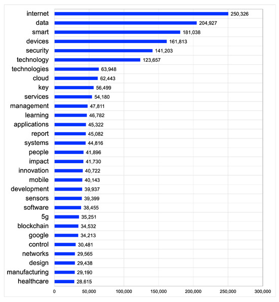 The IoT refers to the collection of smart devices that have ubiquitous connectivity, allowing them to communicate and exchange information with other technologies [29]. As more devices connect to the internet and to one another, the IoT is an emerging technology that is considered as being among the largest disruptors, particularly for companies across industries, due to their ability to innovate and develop new products and services, increase productivity with higher levels of performance, improve inventory management, and allow greater access to consumer data to observe patterns and behaviours for continued product and service enhancements [30]. In this case, in this paper, tweets published between the aforementioned dates were collected based on the presence of the hashtags “IoT” or “Internet of Things”. A total of 4,520,934 tweets containing the aforementioned keywords were collected and divided into datasets based on the month and year they were published. The dataset with the most tweets (92,290) was reported in November 2017, with December 2021 reporting the fewest tweets (29,793). No retweets or quote retweets were collected; only self-authored tweets were compiled to avoid duplicated data.