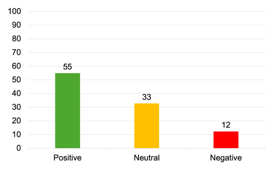 VADER provides a percentage score, which represents the proportion of the text that falls in the positive, negative, or neutral categories. To represent a single uni-dimensional measure of sentiment, VADER also provides a compound score that is computed by summing the valence scores of each word in the lexicon and then normalising the scores to be between −1 (most extreme negative) and 1 (most extreme positive). In the work herein, text segments with a compound score ≤−0.05 were considered as expressing a negative sentiment, those with scores >−0.05 and <0.05 were considered as expressing neutral sentiment, and those with a score ≥0.05 were considered to express positive sentiment. For example, the tweet ‘No fear that a hacker can get access to your camera or thermostat or other electronic devices. Your privacy is 100% protected because the technology is inside your electronics and not located on any server across the world’. achieved a compound score of 0.6734 and was therefore assigned a positive sentiment. Figure 3 reports the distribution of tweets across each sentiment category, with 55% of the dataset being assigned the positive sentiment category, 33% neutral sentiment, and 12% negative sentiment.