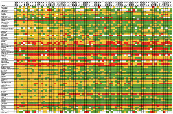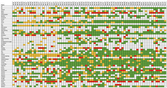 Chronological aspect-based analysis results across an excerpt of emerging technologies from the whole dataset (positive sentiment = green; neutral sentiment = orange; negative sentiment = red).