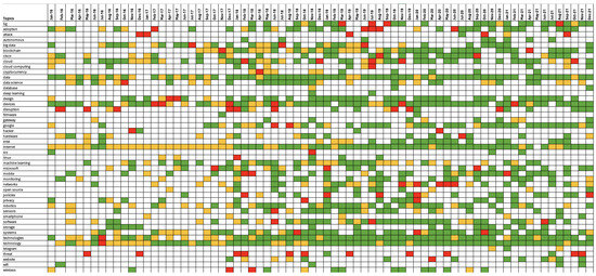 Chronological aspect-based analysis results across an excerpt of emerging technologies from discourse relating to education (positive sentiment = green; neutral sentiment = orange; negative sentiment = red).