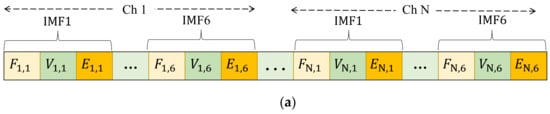 Composite feature formation representing the extracted ones is necessary to input them perfectly in the ML/DL model for ES classification, which is the crucial issue of this study. Each channel has six IMFs, and each IMF is further decomposed into three features, i.e., making 18 (=3 × 6) features per channel. It is essential to carefully consider the characteristics of the features and select the most appropriate representation technique to ensure the optimal ML/DL model performance. This study organized the features in two formats, as illustrated in Figure 3: 1D or unidimensional and 2D forms. These two different forms of organizing the feature values offer different perspectives for analyzing EEG data. In the 1D form represented in Figure 3a, the 18 feature values of each EEG channel are placed one after another in a single line. This arrangement creates a linear sequence where the feature values of the channels are concatenated. For instance, the feature values of 22 EEG channels of CHB-MIT were arranged in a continuous sequence of 396 (=18 × 22) values. For the PHK dataset, it was a continuous sequence of 342 (=18 × 19) values for 19 EEG channels.