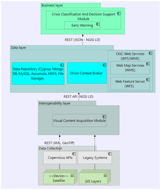 Specifically, in this work, the data collection layer refers to the process of gathering EO (Sentinel) data from the Copernicus API as well as the geospatial data through legacy systems (GIS layers). The latter can be considered an external resource, and it is mentioned as the GIS data model (Appendix A.3). The interoperability layer utilizes the Visual Content Acquisition module to process the Sentinel and GIS data. The data collection and interoperability layer is part of the Satellite Imagery data model described in Appendix A.2 below.