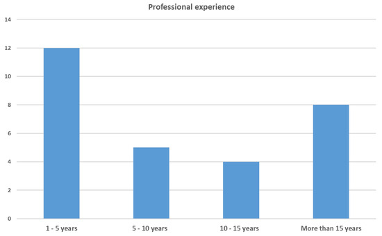 Regarding the participants’ professional backgrounds, the majority (59%) possessed substantial experience, defined as over 5 years of experience as depicted in Figure 4. It is worth mentioning that there was a good gender balance among the participants, with 59% being male and 41% female.