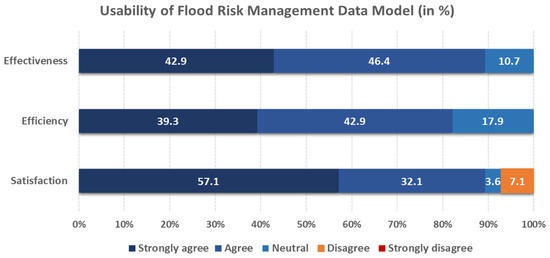 Similar findings can be drawn concerning the usability of the Flood Risk Management data model (Figure 6). In total, 89.3% of responders are satisfied after the usage of the particular model (strongly agree or agree). Additionally, they believe that it can effectively aid them in completing their tasks reliably (level of effectiveness is around 89.3%). Slightly different are the results in terms of the efficiency of the Flood Risk Management data model, where the percentage of participants who agree that this DM is efficient reaches 82.1% against those who are neutral (17.9%). One potential reason is that the creation of Flood Risk Maps depends on data models (i.e., Satellite Imagery) and other processes that may insert a slight delay in the visualization of the flood hazard and risk maps. This can be translated as an inefficiency of the DM by a few responders.