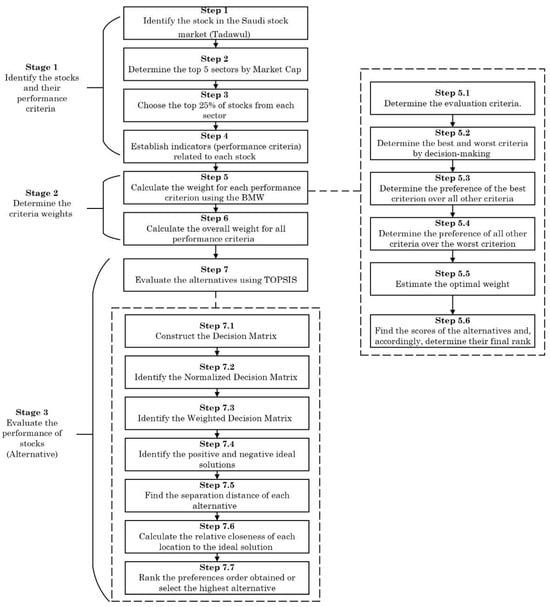 The structure of the suggested methodology for measuring and ranking stocks on the Saudi Stock Market is shown in Figure 1. The proposed method consists of three consecutive stages. In the first stage, an evaluation was conducted to evaluate the top five sectors of the stock market by market cap. The number of listed companies varies across sectors, and the selection is based on the top 25% of stocks in each sector by market cap. The second stage employed the BWM to calculate the weights of the criteria collected from the expert subject matter. In the third stage, the chosen stocks were ranked using the TOPSIS approach. This involved identifying an alternative closest to the ideal solution and farthest from the negative ideal solution in a multidimensional computing space. These rankings were based on the overall performance of the stocks, as determined by the weighted criteria calculated in the previous stage.