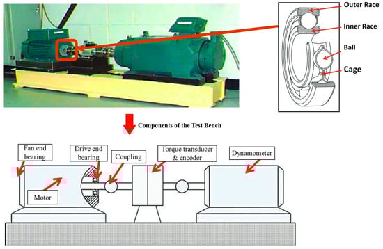 The dataset from the CWRU [13,14] was used to evaluate the proposed methodology. Figure 2 shows the CWRU’s experimental rig for studying ball-bearing defects. Vibration measurements were acquired with three accelerometers placed in the 12 o’clock position on the housing of the drive end (DE) and fan end (FE). SKF deep-groove ball bearings of types 6205-2RS JEM and 6203-2RS JEM were employed for the DE end FE, respectively.