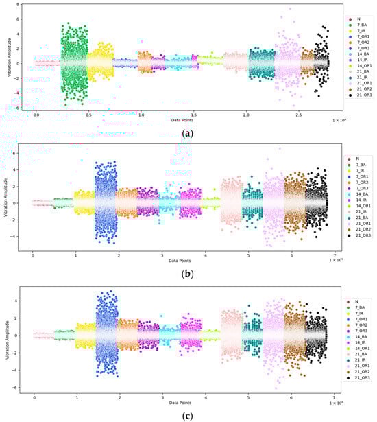 (a–c). Raw accelerometer data scatter representation revealing the behavior of 14 fault class severities in bearing components for three loading scenarios. (a) Loading Level—0 hp. (b) Loading Level—1 hp. (c) Loading Level—2 hp.
