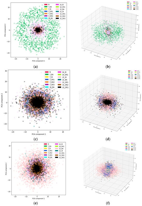 Visualizing the PCA projections of the data under the two loading levels in Figure 5c–f, it was found that the fault class labels with the largest depth faults (21_BA, 21_IR, 21_OR1, 21_OR2, and 21_OR3) are distinguishable in the 2D PCA plot, while the other fault class labels with lower fault depths are clustered behind the larger ones. Furthermore, in the 3D PCA plot, there were no new projection patterns that emerged beyond those already observed in the 2D plots. This finding suggests that the fault class labels with larger fault depths have a unique pattern of variation that distinguishes them from the other fault class labels. This could be because the faults with larger depths involve more significant changes in the underlying physical or geological processes, resulting in more distinct patterns of variation in the data. On the other hand, the fault class labels with lower fault depths may not exhibit as much variation or may be more difficult to distinguish from each other due to their relatively minor impact on the underlying processes.