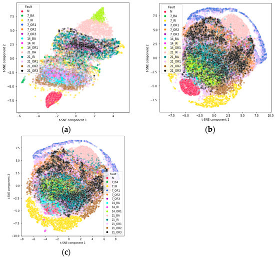 t-SNE analysis on bearing dataset: (a) t-SNE on 0 hp data, (b) t-SNE on 1 hp data, (c) t-SNE on 2 hp data.