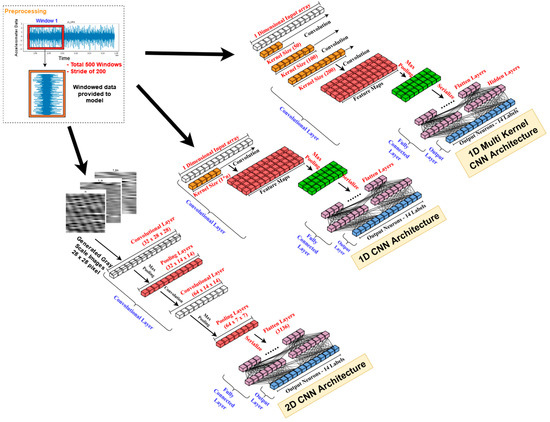 A CNN is a type of neural network particularly suited for image classification tasks. It consists of multiple convolutional layers, which apply a set of learnable filters to the input image, followed by pooling layers to reduce the spatial dimensions of the feature maps. The output of the last convolutional layer is typically flattened and fed into a fully connected layer for classification. Three powerful variances of CNN have been developed and used to classify faults using the raw accelerometer data in this research article; its architecture is represented in Figure 7 below.