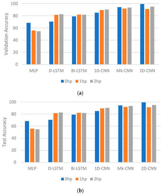 The optimal performance of the models relied heavily on tuning the hyperparameters. In order to achieve greater classification accuracy, it is essential to conduct a hyperparameter search using techniques like “random search” and “Bayesian optimizer”. The models employed in this study were deep neural network architectures, including D-LSTM, Bi-LSTM, 1D-CNN, MK-CNN, and 2D-CNN. The specifications and hyper-parameters for all the tested models are presented in detail in Table 3. The test accuracies for all the different NN models were calculated using Equation (1), and they ranged from 70% to 99%, as shown in Table 4. Several factors contributed to the success of these models; notably, their flexibility allows them to capture complex patterns and relationships within the accelerometer dataset. The deeper architectures of these models allow for the extraction of more abstract features, enabling better discrimination between different classes. In particular, the convolutional layers in CNNs are designed to identify spatial and temporal patterns in data, making them well-suited for tasks like sequential data and image classification. Additionally, the careful tuning of hyperparameters, such as learning rate, number of layers, and number of filters, can lead to better model performance. The best result of all was certainly shown by the 2D-CNN classifier. The accelerometer data transformed into grayscale images allowed the CNN to learn spatial patterns in the images, which can be used to distinguish between different class labels. The 14 class labels captured in imaging allowed the model to learn different levels of abstraction, from low-level features such as edges and corners to high-level features such as shapes and patterns. Additionally, the proper tuning of the hyperparameters of the learning rate, batch sizing, and epoch count established a robust network for classifying raw accelerometer signals.
