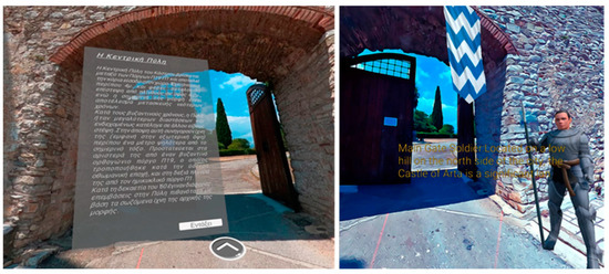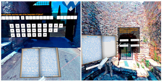 Upon launching the application, users are greeted with a language selection feature where they can choose their preferred language (Greek or English). Following this, a dedicated menu enables them to teleport to the castle’s areas. As they progress, they encounter various educational stations, each dedicated to different aspects of castle’s lifespan including its architecture, daily life, and governance. These stations employ gamified elements such as quizzes and problem-solving tasks to foster engagement. Below, we present a breakdown of the key experiential modules that comprise the application’s virtual tour: