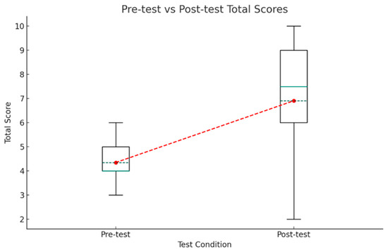 In the preliminary analysis of student performance, we noticed a significant upshift in both the mean and the median scores between the pre-test and the post-test assessments (Table 1, Figure 5). While this points to an overall improvement in academic achievement, the broader dispersion in scores suggest a greater heterogeneity in student performance during the post-test phase. Moreover, when examining the distributional attributes of the scores, the post-test results display a leftward skew, indicating that the majority of students not only improved but also scored above the mean. This contrasts with the pre-test scores, which are more symmetrically distributed, indicating a more unified performance among the cohort.