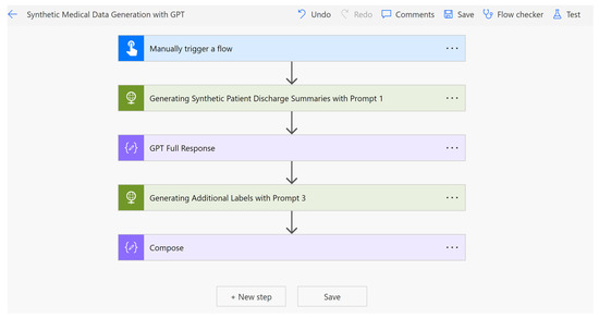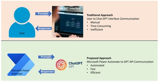In the conventional approach, users of GPT technology access the model through its web interface, initiating interactions via specific prompts to derive outputs from the system (as shown in Figure 3). This traditional approach has been demonstrated by research works [3,4,5,6,7,8,9]. Employing such a traditional methodology to produce synthetic medical data necessitates substantial user involvement, which can be time-consuming. To circumvent the need for manual intervention in querying the GPT interface, the current study integrates the GPT API with Microsoft Power Automate to fully automate the process of generating patient discharge summaries, as shown in Figure 3. Microsoft Power Automate orchestrates the interactions with the GPT through its API, facilitating a seamless automated workflow. Consequently, this novel automation strategy enhances the efficiency and effectiveness of generating synthetic patient discharge messages, thus streamlining the process significantly. As seen from Figure 3, the proposed approach of interacting with ChatGPT API is automated, fast, and efficient.