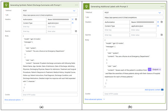 As seen in Figure 4, the orchestration of GPT API communication is performed using Microsoft Power Automate. The HTTP request component of Microsoft Power Automate can autonomously invoke multiple API calls. As shown in Figure 4, the first HTTP post call to GPT API generates 70 discharge messages. The second HTTP post call then critically evaluates these messages and labels them in terms of (1) severity, (2) chances of hospital readmission, and (3) reasoning. The details of both these calls are shown in Figure 5. It should be noted that Microsoft Power Automate allows the second prompt to investigate the previously generated synthetic message through the variable “Output”, as shown in Figure 5b. Thus, the contextual background of the previously generated messages could be efficiently analyzed in the second prompt, along with augmenting the previous messages with newer labels (i.e., severity, chances of hospital readmission, and reasoning). The reasoning information would be validated by expert doctors at a later stage.
