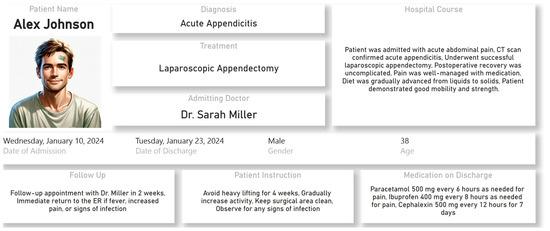 For Alex Johnson (Figure 6), the GPT response before generating the synthetic patient image is “Based on this summary, I will create an artistic representation of Alex Johnson, a 38-year-old male who has just recovered from an appendectomy. Let’s visualize Alex as having short brown hair, a medium build, and a friendly appearance, reflecting his recovery phase”.