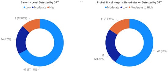 Date of admission ranged from 12 January 2021 to 20 December 2021. Date of discharge ranged from 20 January 2021 to 30 December 2021. From these date fields, the duration of hospital stay could be calculated. Hospital stay ranged from 3 (for Sophie Duncan) to 334 days (Maria Johnson). Finally, Figure 11 shows the distributions of labeling data (i.e., Severity level and Chances of Hospital Re-admission). As seen from Figure 11, 12.86% of the discharge summaries were labeled with the severity level of high and 67.14% of the discharge summaries were labeled with severity level being low. In terms of hospital re-admission, 60% of cases were moderate, 24.29% of cases were low, and 15.71% of the cases were flagged as “moderate to high”.