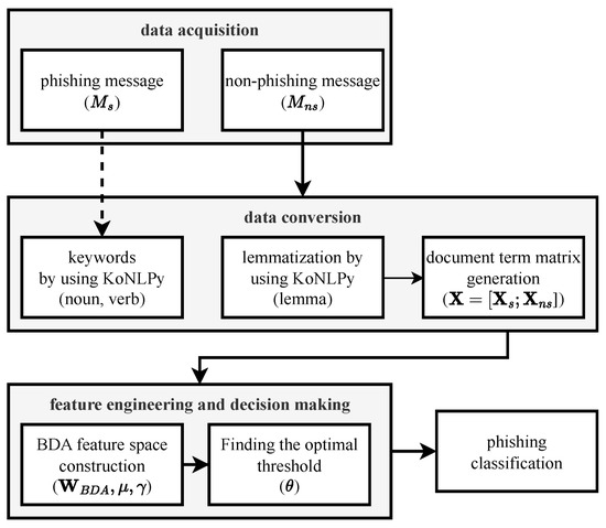 In this paper, we propose a method for classifying phishing messages in a Korean dataset with a class imbalance problem. The proposed method consists of three stages: data conversion, feature engineering, and decision. In the data conversion stage, phishing messages () and non-phishing messages () were assigned as the target class and the non-target class, respectively. Additionally, we extracted keywords of verbs and nouns from the collected phishing messages using a morphological analyzer. Then, we created a numerical BoW composed of the frequency of each keyword. In the parameter estimation stage, we generated the BDA feature space () from the training dataset, setting the optimal parameters. These included the regularization parameter, the number of BDA feature vectors, and the threshold needed to construct the space. Finally, in the decision stage, we measured the distance between the projected test data and the mean vector of the training data that belongs to the phishing class within the BDA feature space. Based on this distance and a specified threshold, we classified the messages as either phishing or non-phishing. The overall procedure of the proposed method is shown in Figure 1.