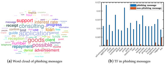In the feature selection stage, when non-phishing messages are defined as “everyday conversations” the freedom of text data increases, resulting in a larger number of features. Fortunately, phishing messages exhibit a characteristic of being written with similar content and randomly sent to others, regardless of the author. Therefore, when focusing solely on phishing messages, the frequency of specific words can appear high. Figure 2 presents the extraction of major keywords with high proportions in phishing messages and the frequency of major keywords appearing in . Figure 2a visualizes the distribution of major keywords (verbs or nouns) that appear in both and using a word cloud. Overall, keywords such as “application”, “goods”, “consulting”, and “repayment” dominate a significant portion. Figure 2b shows a histogram of the top 20 keywords with the highest frequency in . For the same keywords, the frequency in differs significantly from that in . Specifically, despite the approximately 70-fold volume difference between the non-phishing and phishing classes, there is a distinct difference in the frequency of specific keywords between the two. Therefore, we construct the features of the BoW using only the features extracted from .