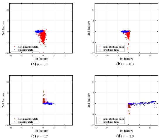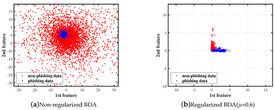 In Equation (5), is the parameter controlling the variance of . serves to solve the asymmetry between the target class and non-target class. Generally, classification models are biased towards the distribution of the non-target class, relative to the target class, which holds a small amount of data. To address this problem, regularization simply extends the scope of the target class by adding a small value to the diagonal elements (variance) of the covariance matrix. When the value of is 0, there is no change in the distribution of the target class. As the value of increases, the variance of the target class gradually expands, ultimately leading to a more robust distribution of the target class. If to the extreme, the target class loses the characteristics of the distribution it has in the BDA feature space. Figure 3 shows the results comparing non-regularized BDA and regularized BDA. In Figure 3a, the conventional BDA without regularization recognizes the distribution of the phishing class (target class) as part of the non-phishing class (non-target class). On the other hand, in Figure 3b, it can be seen that the asymmetrical structure of a small-scale target class and a large-scale non-target class has been mitigated when .