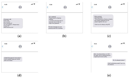 We collected 615 phishing messages and 42,594 non-phishing messages for phishing messages classification. Phishing messages associated with actual messenger phishing crimes, which involve personal information and social issues, are not disclosed due to privacy and societal concerns. In this paper, we collected a total of 615 images directly uploaded by messenger phishing victims from 2013 to 2021, converted them into text, and used them as a phishing dataset. The collected phishing dataset includes various types of crimes, such as cryptocurrency scams, advertising scams, loan scams, impersonation of public institutions, and impersonation of acquaintances. Figure 5 presents examples of the directly collected dataset. Figure 5a illustrates an example related to cryptocurrency scams, where criminals masquerade as cryptocurrency exchanges and send scam messages claiming that the victims’ assets are at risk. Figure 5b showcases an example of an advertising scam, where phishing attempts are made through advertisement-like messages, such as job postings or delivery notifications. Furthermore, Figure 5c depicts a form of loan scam where criminals impersonate loan providers and deceive victims in need of money. Figure 5d demonstrates a type of fraud where criminals impersonate public institutions and induce victims to click on specific URLs, often involving scams related to COVID-19 relief funds. Lastly, Figure 5e presents an example of impersonating an acquaintance, where criminals pose as the victim’s acquaintances and exploit them for financial gain.