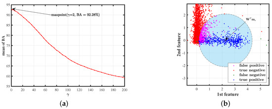 Evaluation of the BA metric based on parameter settings. (a) Mean of BA by in the training phase. (b) Optimal BDA feature space projected with training data using BA (when, = 0.6; = 2; = 2.4130).