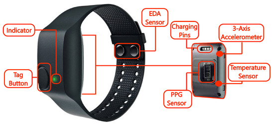 In our investigation, a group comprising 40 elderly individuals ranging in age from 60 to 80 years was selected as the subject population. Within this sample, the demographic distribution is comprised of 28 female and 12 male participants. As we are targeting a specific age group, 40 participants should be adequate for our experiments. Due to data corruption, the dataset of one participant was deemed unsuitable for inclusion, thus resulting in a final dataset derived from 39 participants. To provide an unbiased dataset, a thorough screening procedure was conducted on each participant prior to their registration in the experimental protocol to determine whether they had any pre-existing medical illnesses or disorders. We collected physiological data using the Empatica E4 wristband, which has built-in sensors for skin temperature (ST), photoplethysmography (PPG), and electrodermal activity (EDA), as illustrated in Figure 2.