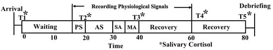As a stress inducer, the Trier Social Stress Test (TSST) protocol was employed for the experiment. The TSST, a widely recognized and established experimental framework, is distinguished for its capacity to stimulate stress within a context that emulates naturalistic conditions [29]. The procedural sequence of the TSST encompasses distinct phases, as shown in Figure 3. It consists of the waiting interval, prestress phase, stress induction period, and subsequent recovery phase. As part of the preparatory stage, participants engage in the completion of demographic questionnaires. After the waiting period, the prestress (PS) phase starts, during which the base measurements are acquired. The collective duration of the waiting interval and the prestress phase comprise a duration of 20 min (T1–T2). Then, the prestress and stress phases span a duration of 20 min (T2–T3). The stress-inducing session is partitioned into three discrete segments: an initial 10 min span designated as the anticipatory stress phase (AS), which is succeeded by a 5 min interval encompassing speech and cognitive arithmetic exercises (M). During the anticipatory stress phase (AS), participants are tasked with a continuous discourse on a designated topic for 5 min while being observed. Then, they are engaged in the cognitive arithmetic exercise that requires resolving basic addition and subtraction equations. Importantly, the complexity of the cognitive tasks increases progressively with each accurate solution. The study ends with the inclusion of two sequential 20 min recovery intervals (T3–T5). Throughout the course of the experiment, salivary samples were collected on five distinct occasions corresponding to the time points denoted as T1, T2, T3, T4, and T5.