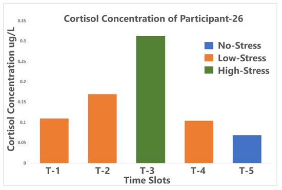 The participants’ saliva samples were dispatched to the laboratory for cortisol concentration analysis. We classified cortisol levels into three distinct categories, namely No Stress, Low Stress, and High Stress, serving as the reference for addressing the multiclass classification problem. We designated the minimum value among the samples taken at time points T1, T2, and T5 as relaxed or No Stress, with the other two being categorized as Low Stress. The highest of the two samples collected at time points T3 and T4 was labeled as High Stress, while the remaining one was classified as Low Stress. Ultimately, these labels were expressed as numeric integers [30]. Figure 4 shows an example of cortisol concentration for a participant from the dataset. According to the algorithm mentioned before, the assigned labels would be No Stress: T-5, Low Stress: T-1, T-2, T-4, and High Stress: T-3. These reference labels were used as ground truth in laboratory settings for validation purposes.