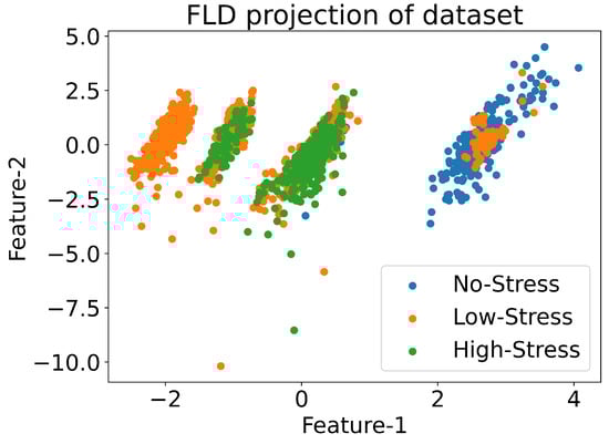 The labeled data were then projected with Fisher’s Linear Discriminant (FLD) in Figure 5. It is a dimensionality reduction method that uses a projection vector to reduce the dimension of the dataset from f to , as shown in Equation (1).