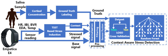 Stress states can also manifest in behaviors such as eye movements, facial expressions, and sleeping and speech patterns [8]. These measures have been extensively utilized in laboratory settings for stress detection. Physiological signals are more practical to collect and offer greater objectivity than behavioral indicators. The advent of wearable sensors has provided a solution, thus enabling the use of wrist-worn devices for portable, inconspicuous, and noninvasive collection of physiological signals. Again, different combinations of signals from theses sensors also effect the outcome of stress response. Studies have shown the added benefit of using sensor fusion. Sensor fusion indicates the usage of combined features from multiple sensors that can dictate the output. Exercise, walking, and running, on the other hand, can generate a stress-like reactions, even though they are not detrimental to health. To address the problem, context-based machine learning algorithms that combine context with digital biomarkers are being developed to distinguish between different sources of stress [9]. Context typically refers to the information surrounding a particular event or situation that can be leveraged to make better predictions or decisions. This surrounding information can include a wide range of factors depending on the application. Subjective stress is used as the ground truth, or gold standard, in these investigations, which are mostly directed toward younger individuals. On the other hand, according to studies, salivary cortisol is a prominent gold standard for stress biomarkers and should be used for ground truth estimation [10] instead of questionnaires or surveys filled out by third parties. But this approach is more suited for laboratory setting only and harder to obtain experimental results in real life settings.