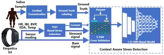 For quite some time, the scientific community has acknowledged the importance of monitoring stress levels based on physiological signals. The majority of currently released works, however, are focused on younger adults or fail to take advantage of relevant contexts. However, the literature in this domain shows that biomarkers like oxidative stress, cortisol, and metabolic imbalances are highly correlated with age and are fairly distinguishable among the age groups [21]. Similarly, the use of cortisol concentration as a stress biomarker has also been investigated. To calculate stress levels, the majority of studies have relied on subjective procedures or surveys. While there have been recent experiments in context-based stress detection, feature selection requires significant human involvement. The next step toward improvement will require an automatic feature encoder that employs context information and cortisol as the ground truth. With that in mind, we incorporated a 1D CNN-based feature encoder. CNNs are a type of artificial neural network (ANN) with convolutional layers in their hidden layers [22]. They were first used in computer vision tasks, but they have since piqued the interest of researchers in a wide range of fields, including biosignal classification such as electromyogram (EMG) signal classification for gesture recognition and electroencephalogram (EEG) pattern identification for assistive machine control [23,24,25,26]. The CNN has been used effectively in arrhythmia detection [26], signal component identification [27], biometric recognition [28], and other applications in ECG signal classification. These experiments revealed the power of CNN in biomarker categorization, thus demonstrating that CNN has the capacity to identify stress. They also show the requirements for an for an end-to-end CNN-based context-aware machine learning model for stress biomarker in older persons. Therefore, in our work, we aim to experiment the aforementioned under-explored domains of stress biomarkers. We employ both feature engineered machine learning and CNN-based fully connected networks for stress biomarkers of older adults in laboratory settings and validate the stress labels with cortisol concentration.
