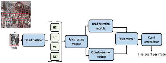 - An effective routing strategy is developed that efficiently routes the patches to either a detection network or regression module based on crowd density variations within an image.