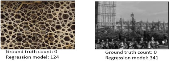 Crowd classification plays a vital role and serves as a preprocessing step in crowd analysis. Most of the existing crowd-counting models are based on regression techniques [20,44,45], where the models learn repetitive structures within the whole image to estimate the count. However, these regression-based models tend to produce false positives when applied to images with No Crowd, which causes significant inaccuracies in crowd counting. Since these regression models are blind and learn from the patterns present in images, they may not distinguish the difference between individual heads and the background. This fact is illustrated in Figure 2.