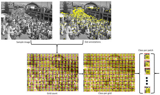 To train ResNet-152 on the obtained patches, we first accumulate the patches from all training images of the dataset and then label each patch as one of the four categories. To label the patches, we employ an automated approach that utilizes dot annotations available for each image. These dot annotations are the markers indicating the presence of human heads within the image. For every patch extracted from the image, we perform a straightforward procedure by counting the number of dots within the patch area. The cumulative count of these dots is then used to determine the label for the patch. This method simplifies the patch-labeling process, as the presence of dots offers a straightforward and automated means of associating each patch with its corresponding crowd density label, making it a practical and efficient approach for crowd analysis tasks. We generate class-wise patches according to the density levels defined in [46]. An “LC” class label is assigned to a patch if the count is greater than 0 and less than 10. An “HC” is assigned to a patch if the count is greater than 15. An “MC” is assigned to patches if the count is greater than 10 but less than 15, and an “NC” label is assigned to patches where the count is 0. The overall pipeline of the patch-labeling process is illustrated in Figure 3.