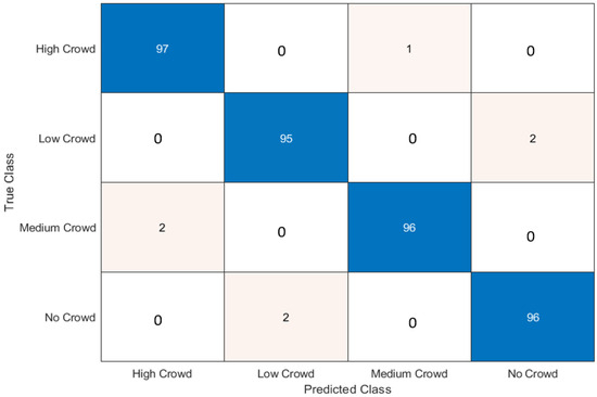 We present the results of our evaluation using two key performance metrics, which are depicted in Figure 7. From Figure 7, it is observed that our Crowd Classifier achieves an impressive top-1 accuracy of 97%. This implies that, in most cases, the classifier accurately assigns the single most probable crowd class to an image.