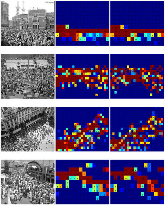 We use VGG-16 as a feature extractor (backbone), which enables the Crowd-Regression Module to extract deep hierarchical features to understand complex crowd dynamics. It is to be noted that we use the first four convolution layers of the VGG-16 and then connect the 3 × 3 Atrous Convolution Grid (ACG) to the fourth convolution layer. The first row of the grid consists of four Atrous Convolution Layers with dilation rates of 1, 2, 4, and 6. The second row of the grid consists of four Atrous Convolution Layers with dilation rates of 5, 7, 9, and 11. The third row of the grid consists of four Atrous Convolution Layers with dilation rates of 8, 10, 11, and 13. From the experiment results, we observe that the choice of Atrous Convolution Layers and their dilation rates plays a critical role in the network’s effectiveness. We observe that using a single Atrous Convolution Layer as originally employed in [52] with a dilation rate of 6, 12, 18 is not able to capture the full spectrum of object sizes. We then fuse the feature maps extracted from the fourth convolutional layer of the VGG-16 backbone with the feature maps generated by the Atrous Convolution Grid (ACG), specifically the output from each row of the grid. This fusion is aimed at combining both the high-level hierarchical features learned by VGG-16 and the multi-scale information captured by the ACG. This fusion enables the network to understand complex patterns and details in crowd scenes while accommodating various object sizes and scales. After merging these feature maps, we utilize a convolutional layer with a filter size of 1 × 1, followed by a SoftMax layer to estimate the crowd density.
